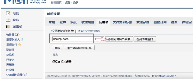 进入您的帐户邮箱-->设置-->反垃圾-->设置域名白名单-->输入chaicp.com 与 boogooo.com添加到白名单-->完成. 如下图